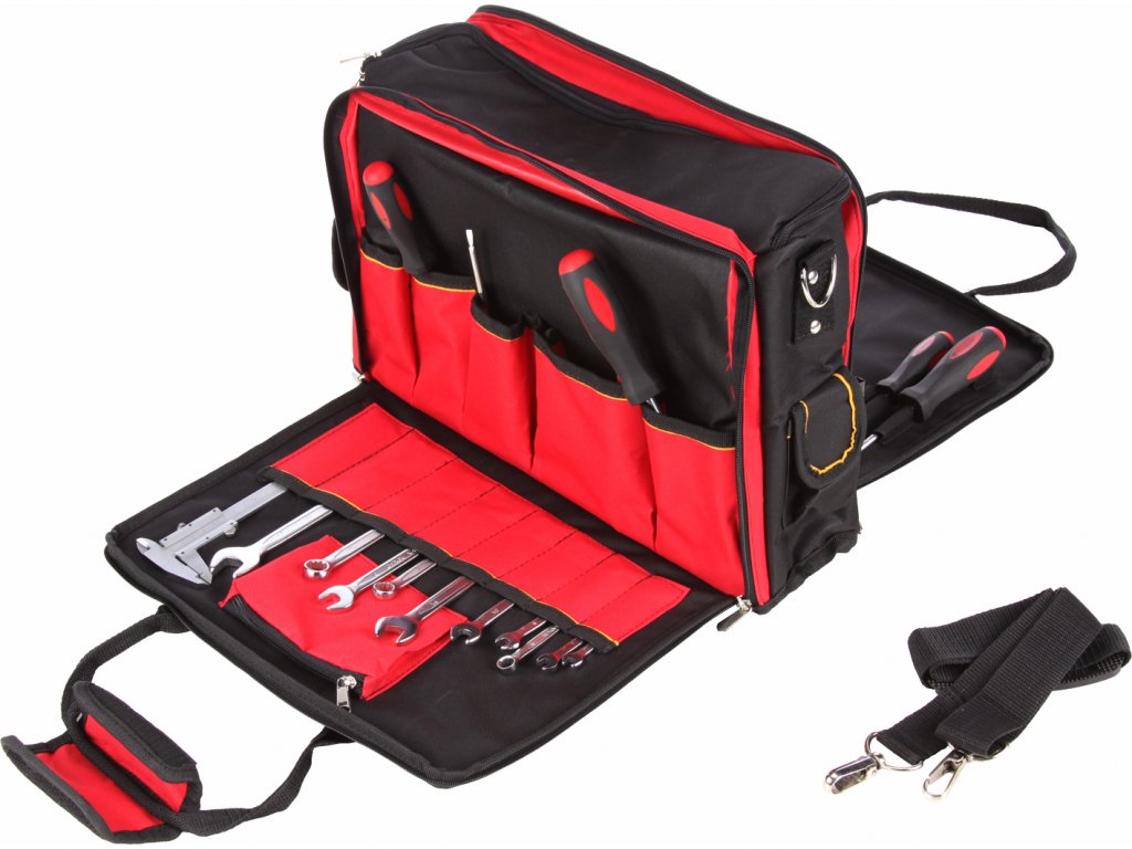Odolná textilní brašna na nářadí se dvěmi otevíracími kapsami pro 31 ks nářadí a 9 příchytkami pro drobné nářadí. Na bocích 3 × malá kapsa se suchým zipem a 2 × otevřená kapsa. Vnitřní velká kapsa je vhodná nejen pro uskladnění aku nářadí. Možnost přenášení buď v ruce nebo pomocí odnímatelného popruhu přes rameno. Rozměry 420 × 190 × 300 mm.