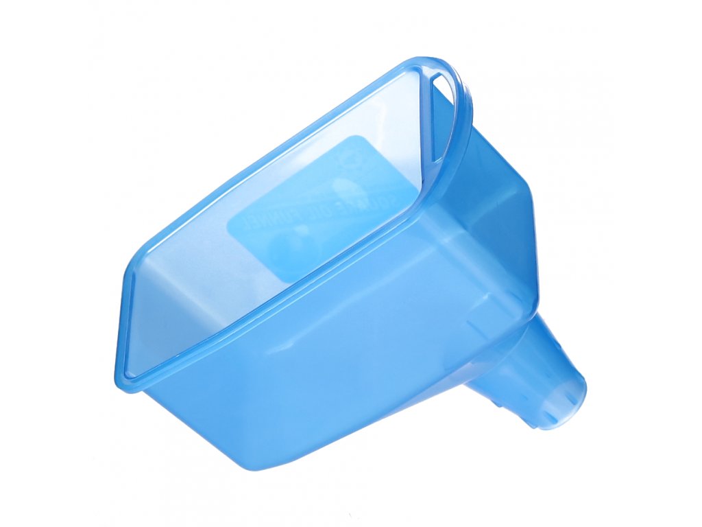 Trychtýř vhodný pro čisté doplňování a výměnu oleje v motoru. Vhodný je hlavně pro plnění z hranatých nádob. Rozměry 170 × 96 × 144 mm; objem 0,85 l.