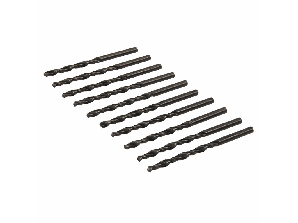 10 ks vrtáků DIN340, z rychlořezné oceli, s úhlem břitu 118°. Vhodné pro vrtání oceli, neželezných kovů, plastů a dřeva.