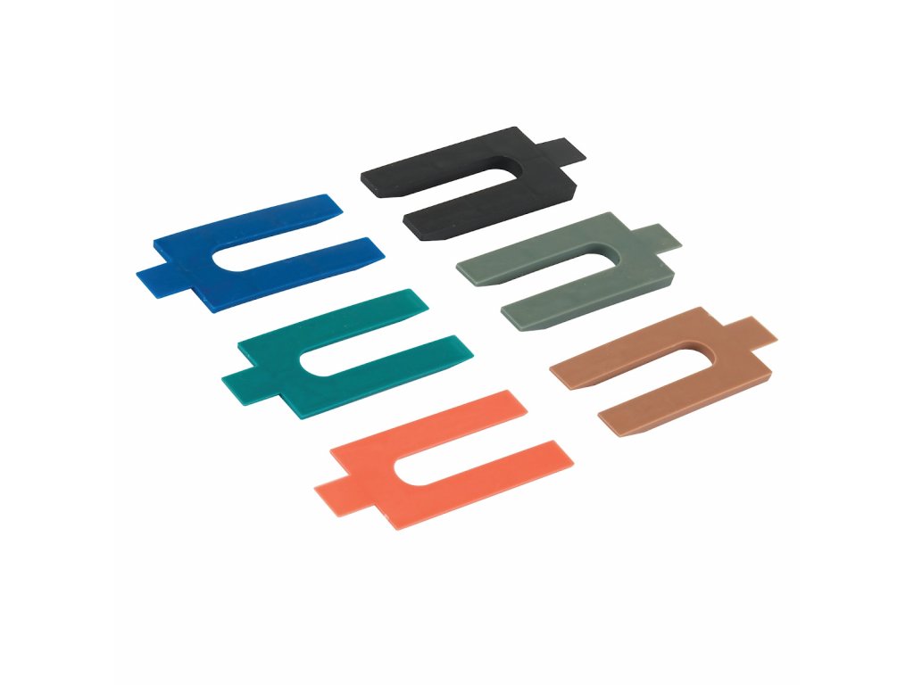 Vidlicový design umožňuje vkládání prvků do úzkých prostorů. Zkosené hrany umožňují snadné vsunutí mezi obložení, opláštění, rámy, lišty a jiné vyrovnávací aplikace. Stohovatelné. Balení obsahuje 100 ks různých barev, velikostí 1, 2, 3, 4, 5 a 6 mm.