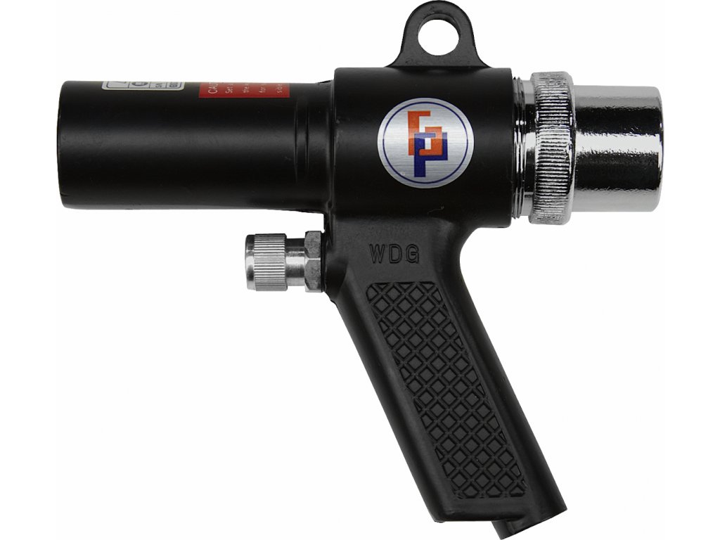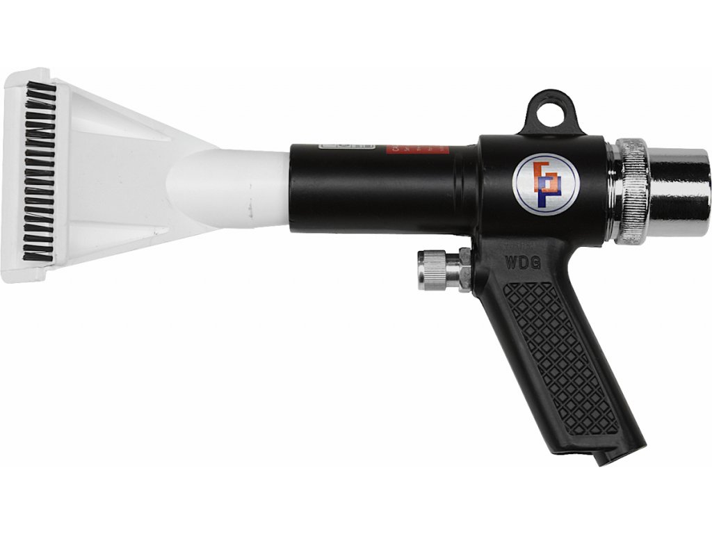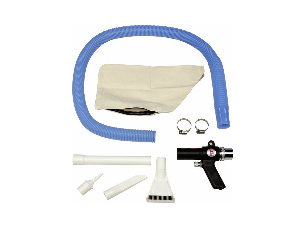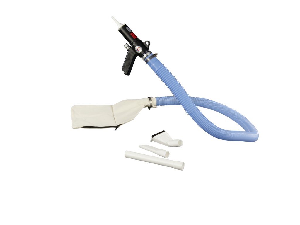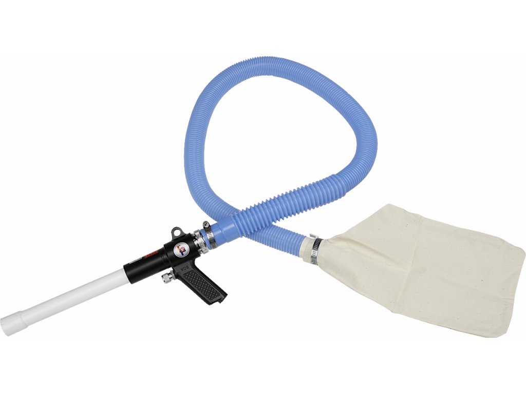 Lehká hliníková pistole je doplněna hadicí, nástavci a textilním sáčkem na odpad. Systém využívá proud stlačeného vzduchu k vytvoření podtlaku a umožňuje účinné odsávání nečistot z povrchu i hůře přístupných míst.